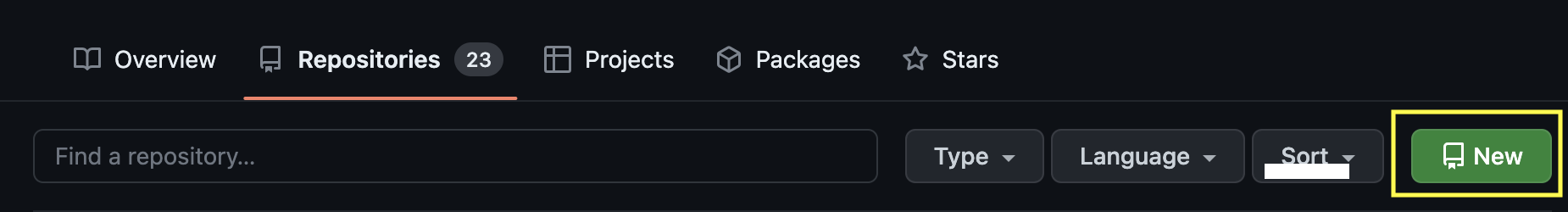 1.깃허브에서 Repository 카테고리에서 New 클릭해서 새로운 Repository 생성합니다.