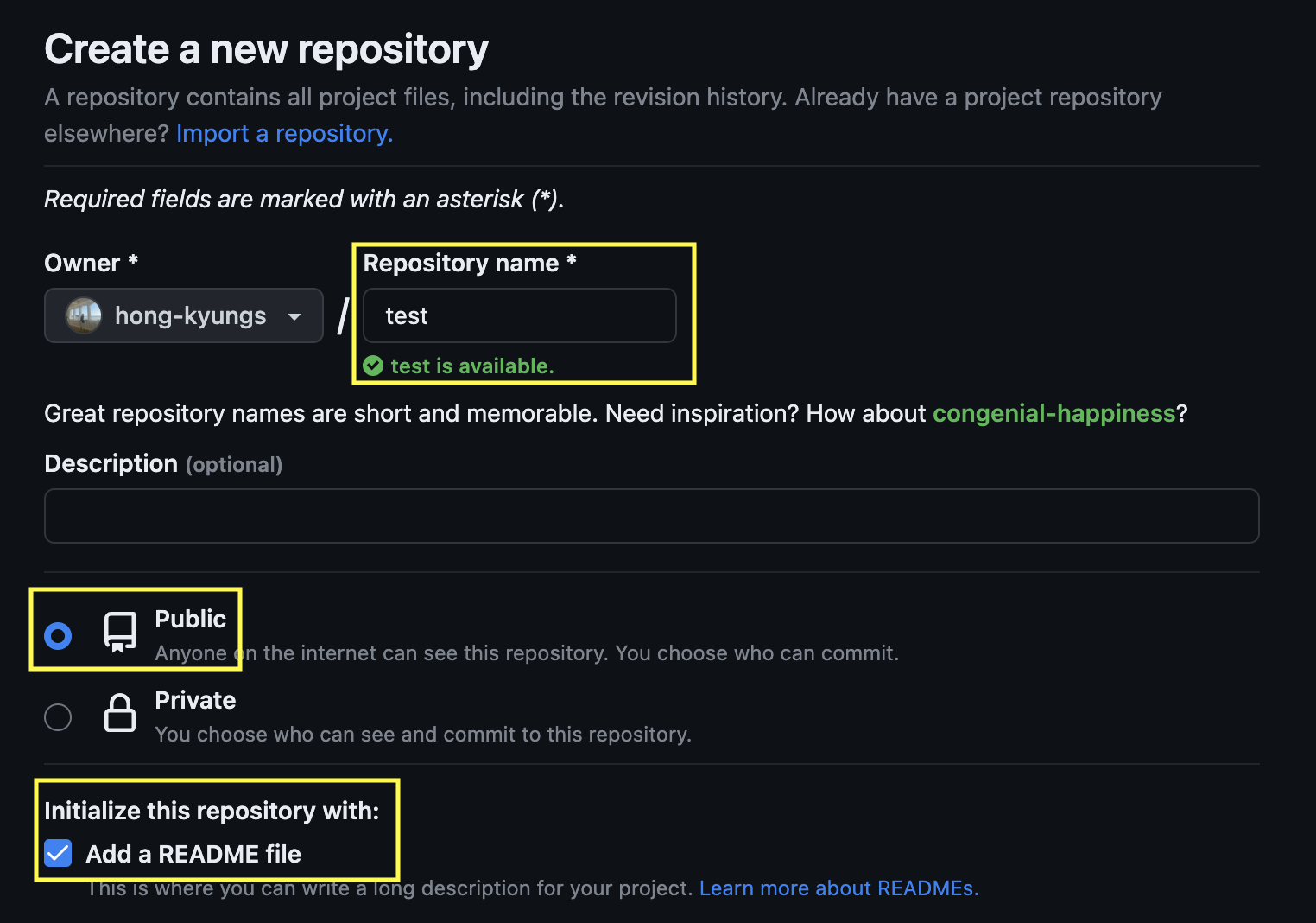 (README.md 파일은 나중에 생성해줘도 되지만 README.md 파일을 추가하여 repository를 생성하는 방법을 선택했습니다.)