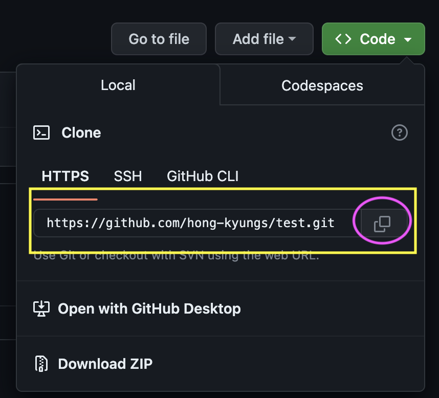1.code버튼을 클릭한 후 나타나는 링크를 복사합니다.